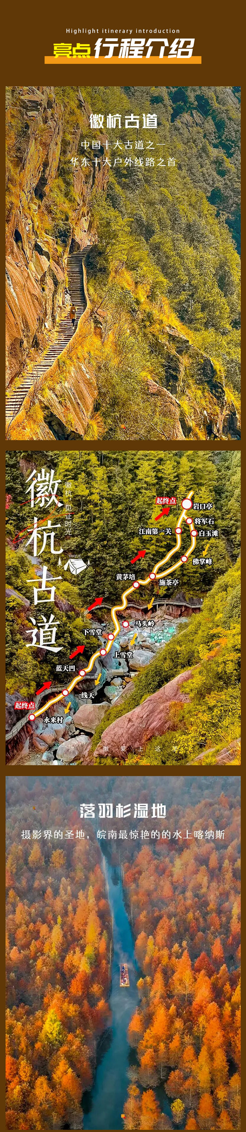 3)门票:徽杭古道60元,落羽杉湿地门票+竹筏60。门票仅供参考,以实际规定为准;