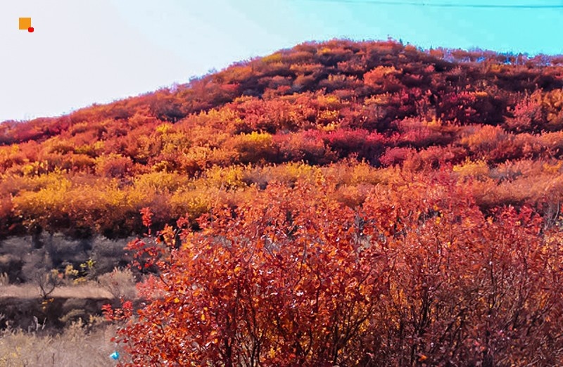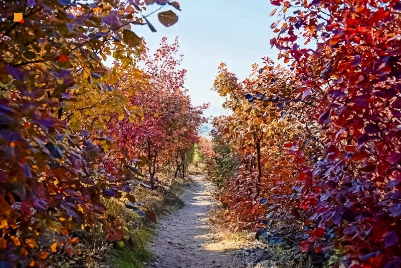 作为北京著名的赏秋打卡地之一,舞彩浅山拥有数万亩各具特色的彩叶林,包括火炬、黄栌、元宝枫、银杏、白蜡等50余种树木,勾勒出赤、橙、黄、绿、紫交织的五彩风景带。