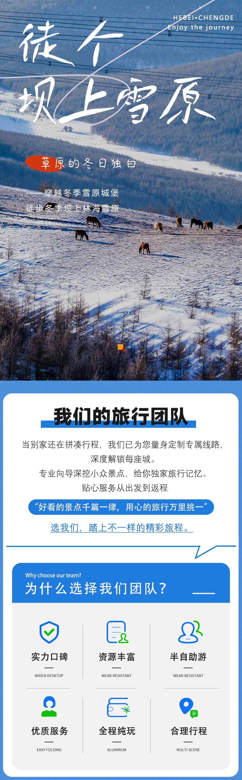 - 早餐后集合出发坝上林海雪原徒步起点,全程约8-10公里,爬升约350米。(注:山上可能雪厚,建议配齐雪套和冰爪。)