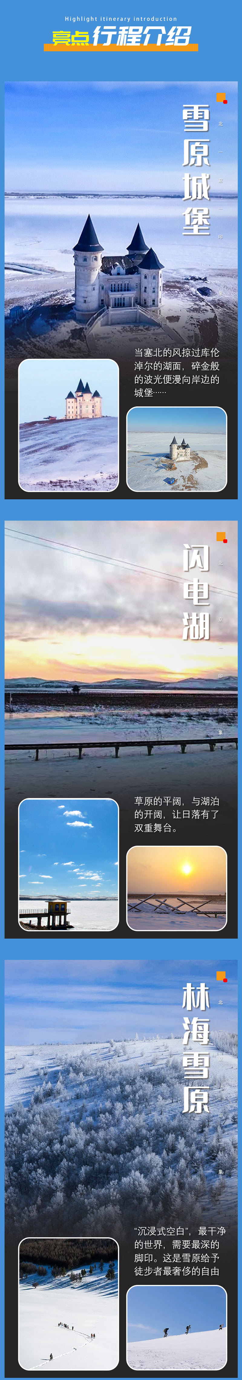 - 午餐后前往雪原城堡徒步起点,开始徒步。全程约6-8公里,爬升约150米。一路冬季雪原美景,登上坡顶,这里有一座欧式风格的蓝色建筑,宛如冬天里的童话城堡,坐落在高原湖泊和草原的环绕中,成为该地区一个独特的地标和摄影热点。
