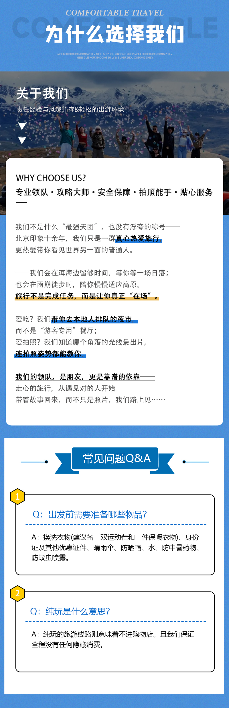 3、活动中请遵循领队安排,务必按时集合!迟到15分钟以上,视为自动放弃后续行程,恕费用不退;