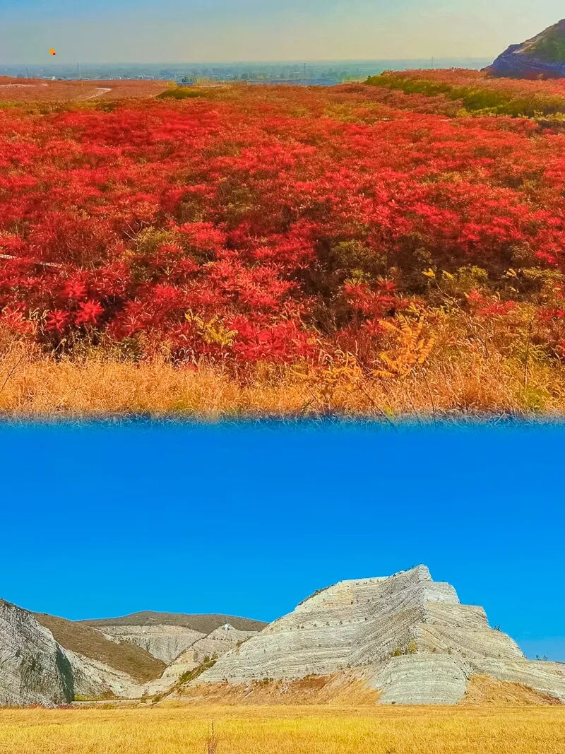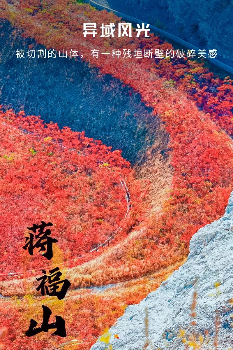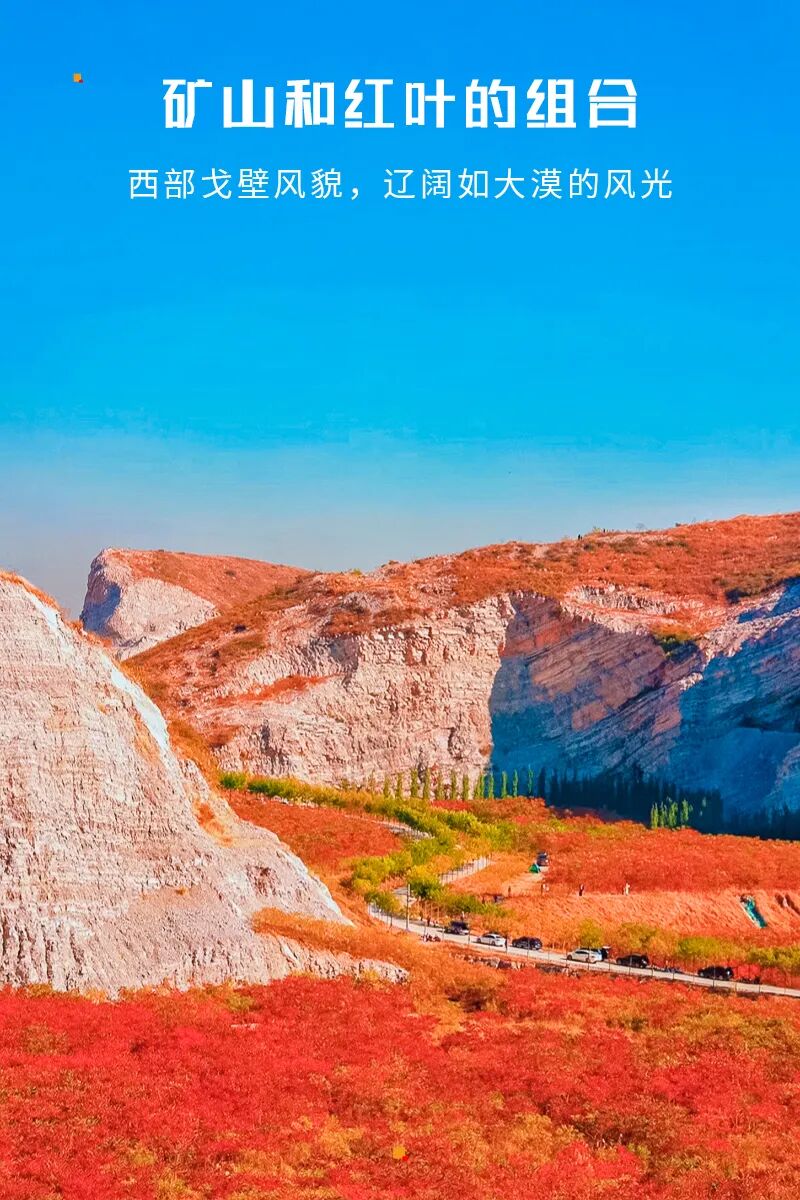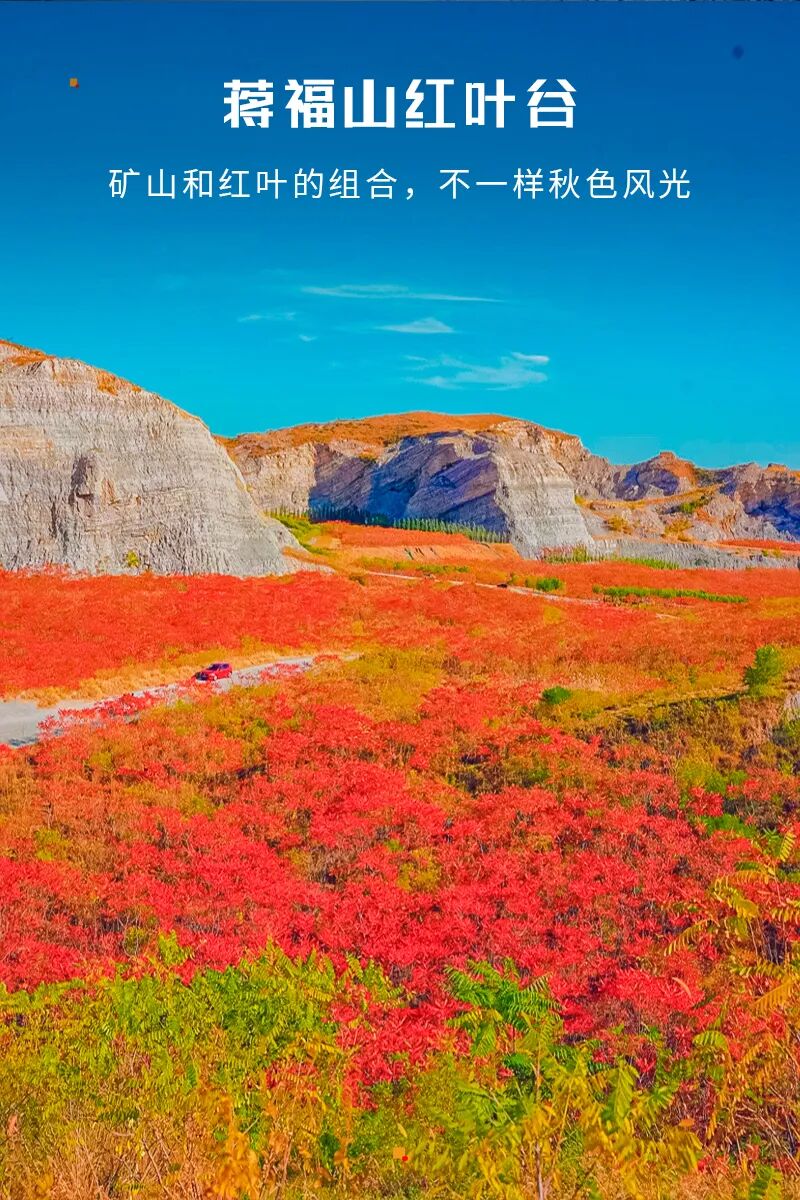 蒋福山是矿山和红叶的组合,被切割的山体,有一种残垣断壁的破碎美感,加上红叶的组合,不一样的风光。这里的红叶主要是火炬树、红枫树还有爬山虎。除了红叶,东边还有辽阔如大漠的风光。可以看骆驼、骑马、露营野餐、遛娃陪老人都没有难度。