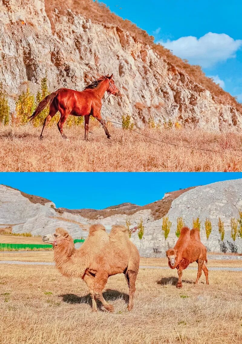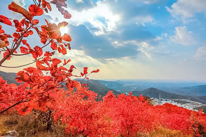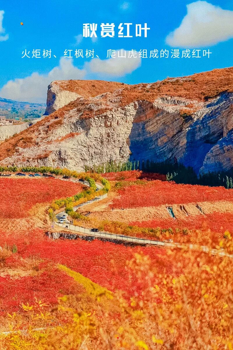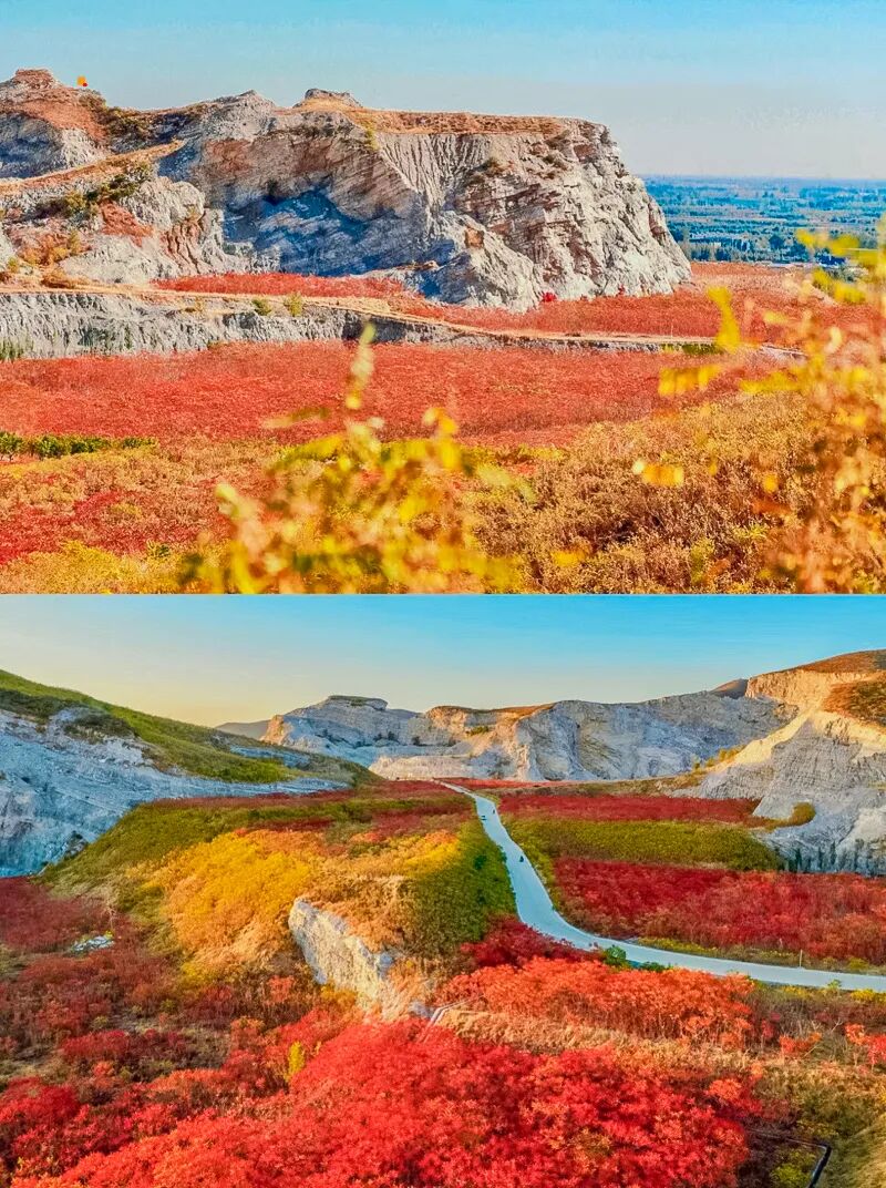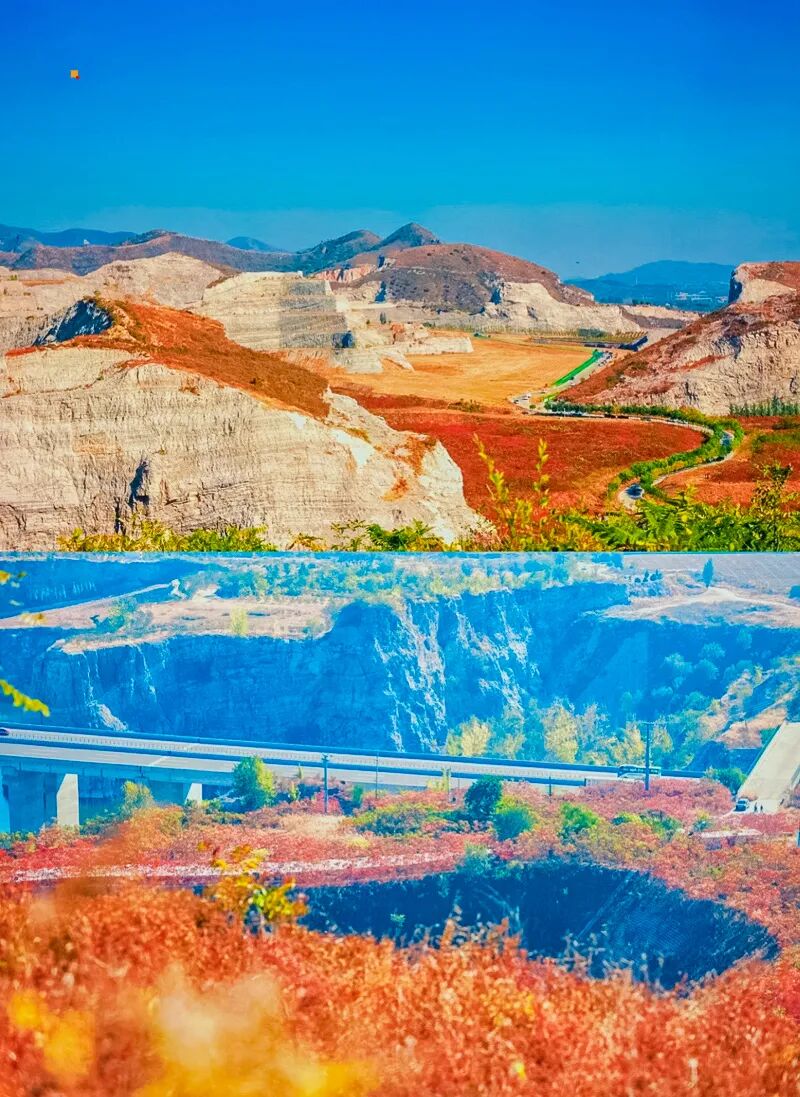 蒋福山是矿山和红叶的组合,被切割的山体,有一种残垣断壁的破碎美感,加上红叶的组合,不一样的风光。这里的红叶主要是火炬树、红枫树还有爬山虎。除了红叶,东边还有辽阔如大漠的风光。可以看骆驼、骑马、露营野餐、遛娃陪老人都没有难度。