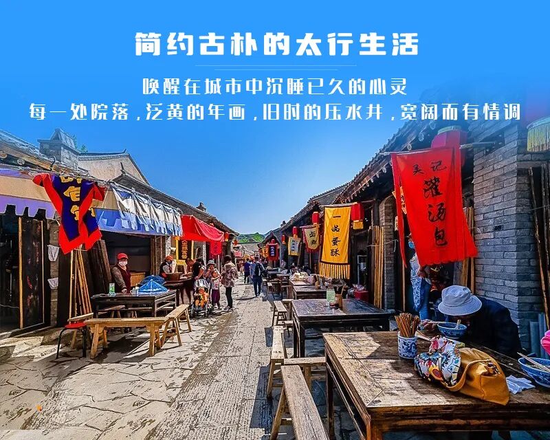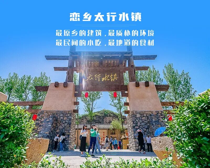太行水镇整体建筑为传统的青砖、黛瓦、黄土墙,分小吃、作坊、院府、农耕等街区,品地道小吃、游太行美景、购农副特产、体农作生活、赏乡村民俗。太行水镇用朴素的太行建筑,简约的太行生活,浓浓的讲述了一个都市人向往的、乡情乡土的乡村故事。建议中午在此午餐,品尝各种特色小吃。